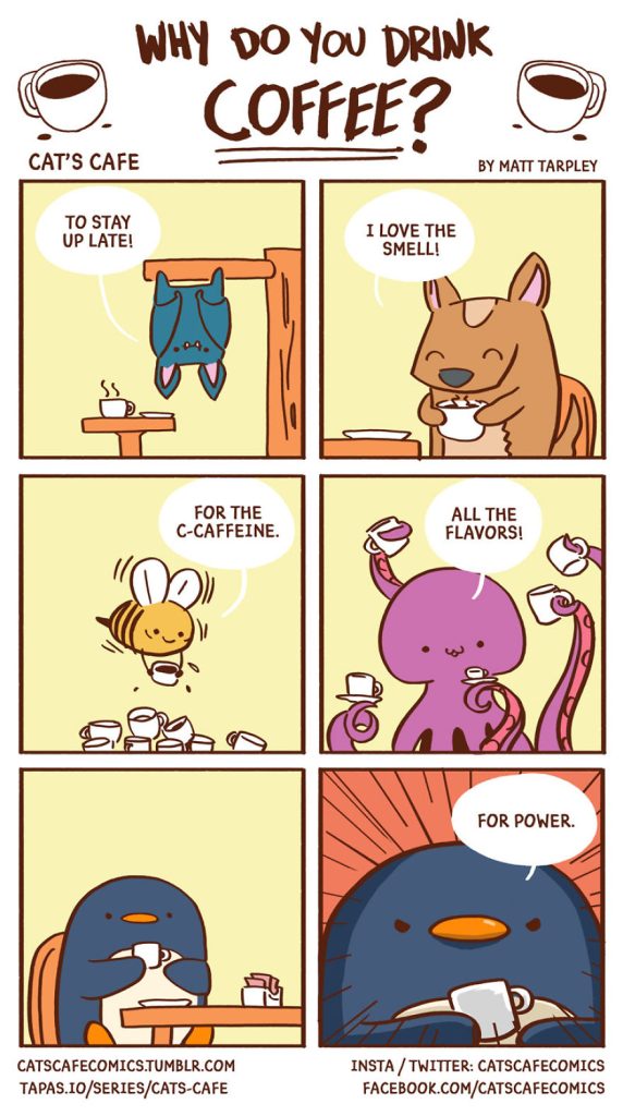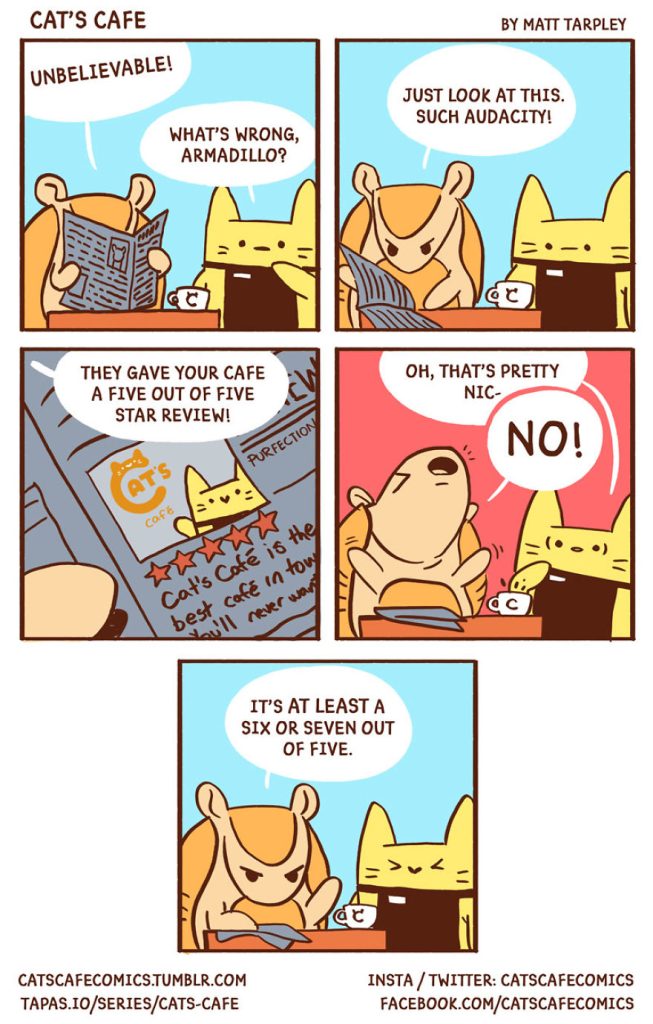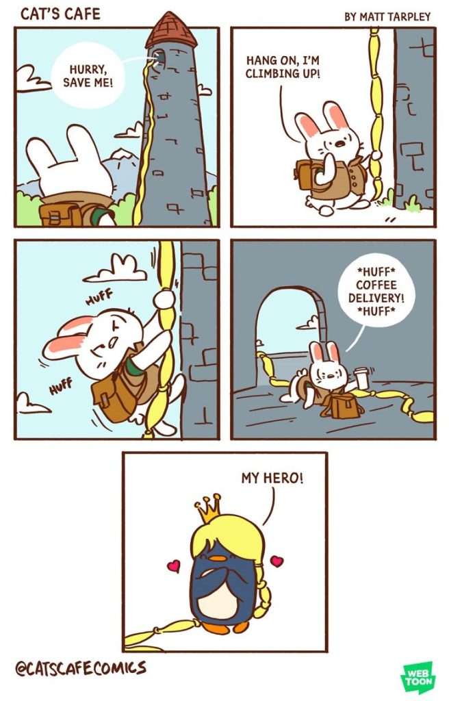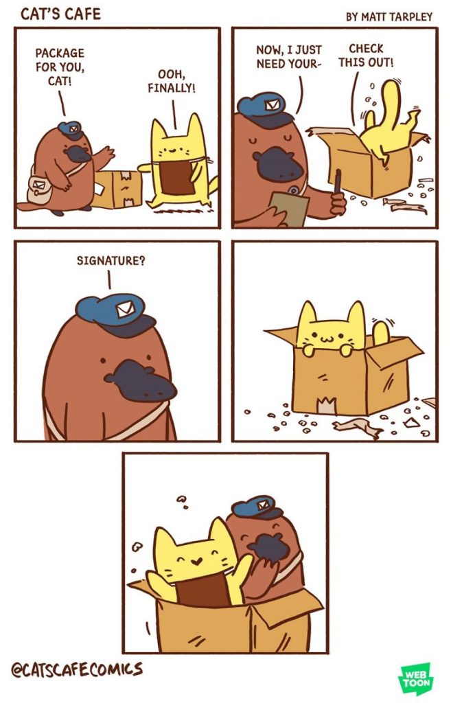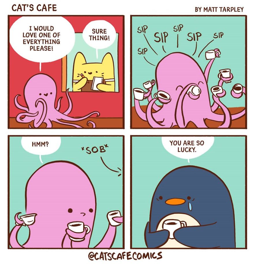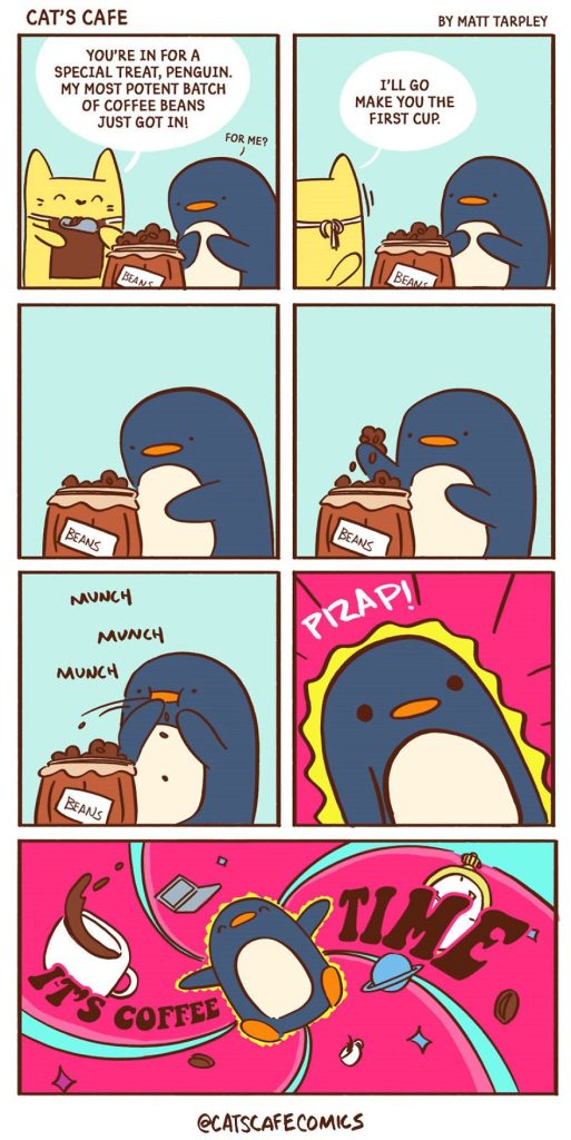 Today, we’re excited to introduce another artist who created a heartwarming webcomic series in December 2017 called Cat’s Cafe Comics. This wholesome series centers around a small coffee shop where local animals come to relax. The creative mind behind this lovable webcomic is artist Matt Tarpley. These delightful comics feature a variety of cute animals, and the artist says they’re guaranteed to brighten your day, just like a good cup of coffee.
