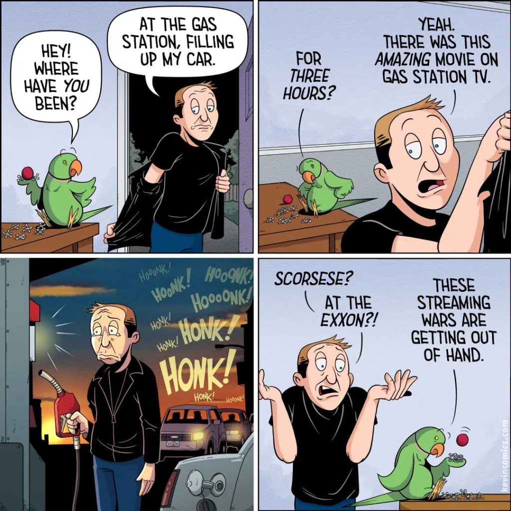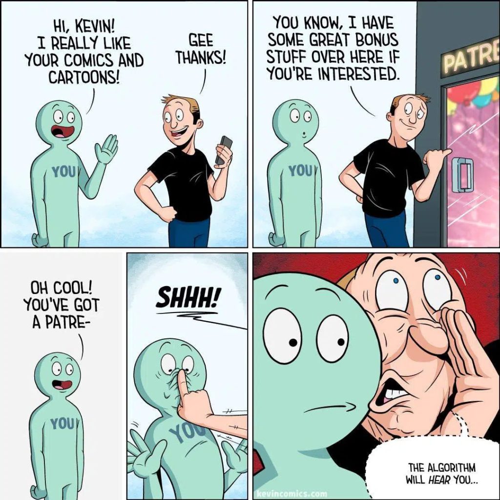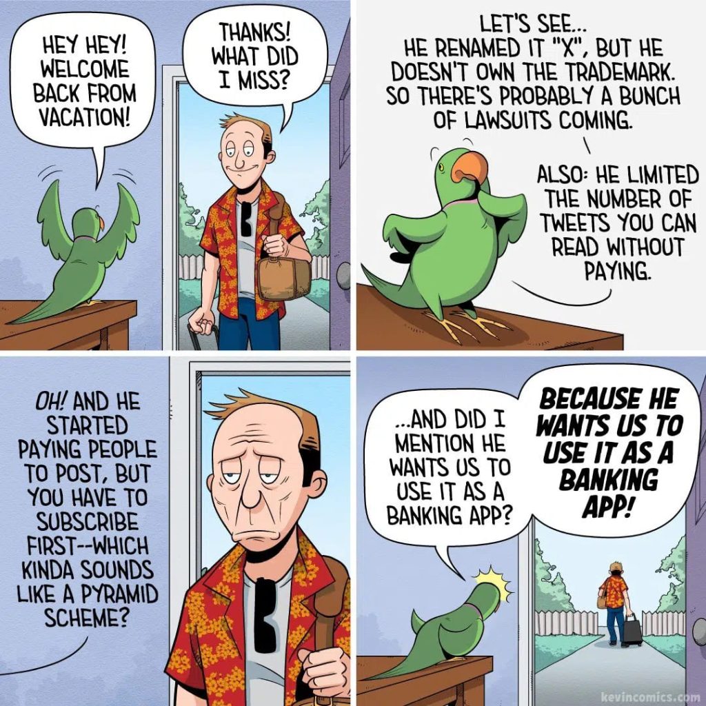 Kevin has a deep love for cartoons, so much so that he often features himself as a cartoon character in his work. His comics have a unique style and distinct feel, making them instantly recognizable. He frequently includes a parrot alongside his cartoon self, adding a layer of amusement that his fans love.