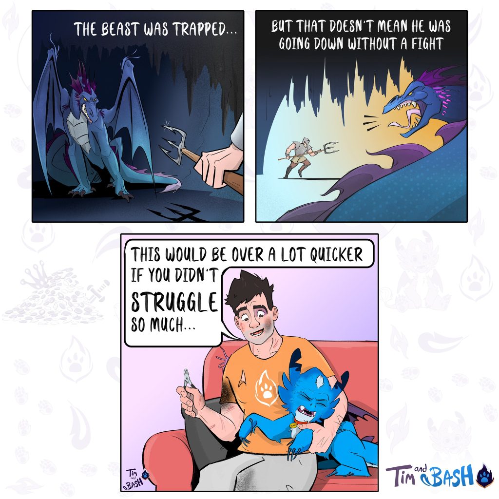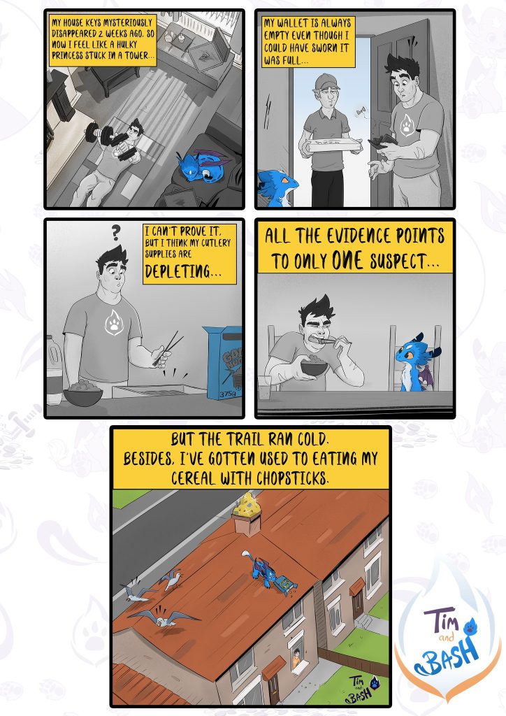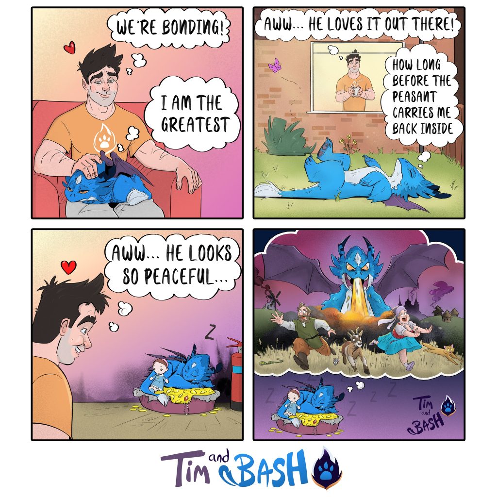 Tim and Bash is an online comic series about the adventures of a baby dragon adopted by a firefighter. The series follows the adorable and funny escapades of Tim, a firefighter, and his mischievous baby dragon, Bash. Created by artist and writer Michael Choma, the series began in 2018 and quickly gained popularity. Michael has amassed 5,015 followers on Instagram for his engaging work.