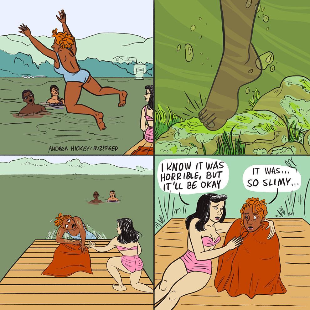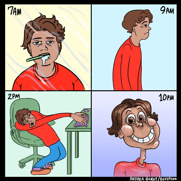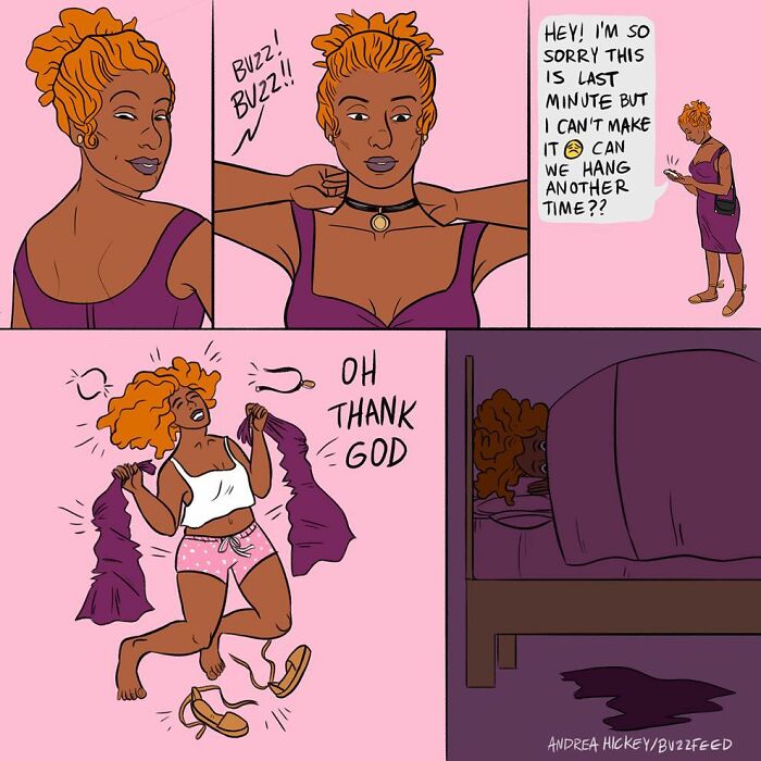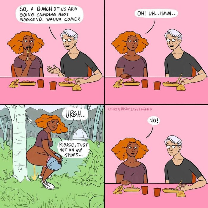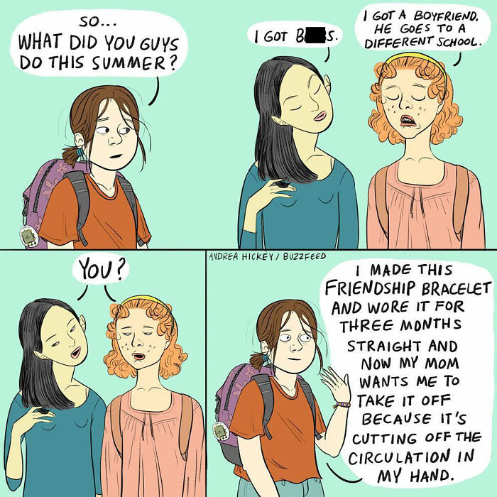 We reached out to Andrea to dive deeper into her comic journey. She opened up about what inspired her to begin creating comics: I started drawing little comics for my friends in high school, exaggerating funny situations that happened in class. I was always doodling on handouts while my teachers were talking, and my best friend and I passed elaborate drawings back and forth during study hall I even posted about that on BuzzFeed. I also created some detailed pieces of art in M.S. Paint RIP. Eventually, I had the chance to draw comics professionally as an illustrator at BuzzFeed.