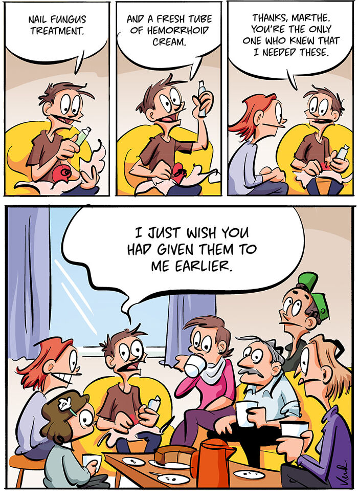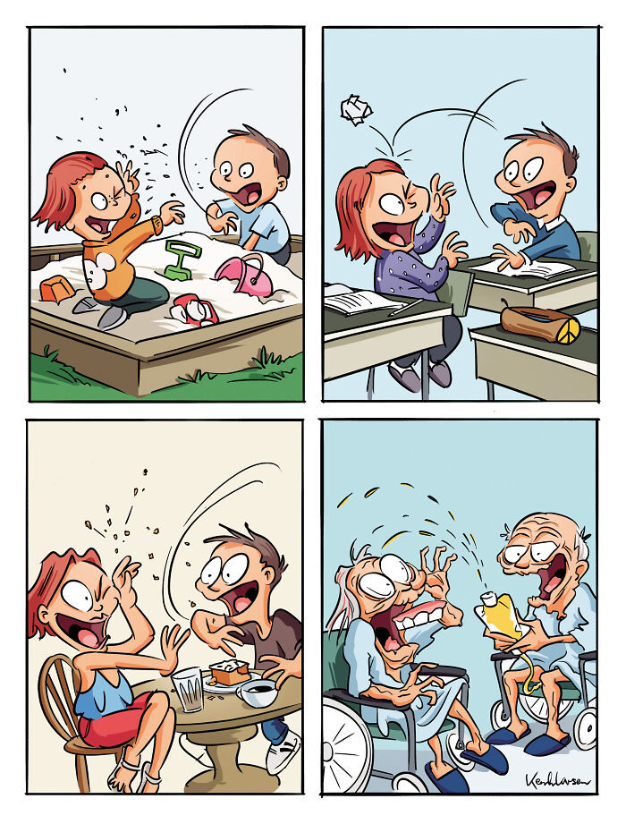The idea for Kenneth Larsen’s Bestie comics has its roots in a lighthearted playful tradition he shared with his childhood friend, Marthe. Kenneth explains that it all began with him drawing silly comics to tease Marthe about the amusing things she would do and say. The two friends found endless humor in their exaggerated depictions of everyday moments, often poking fun at their experiences in ways that felt both absurd and painfully accurate.