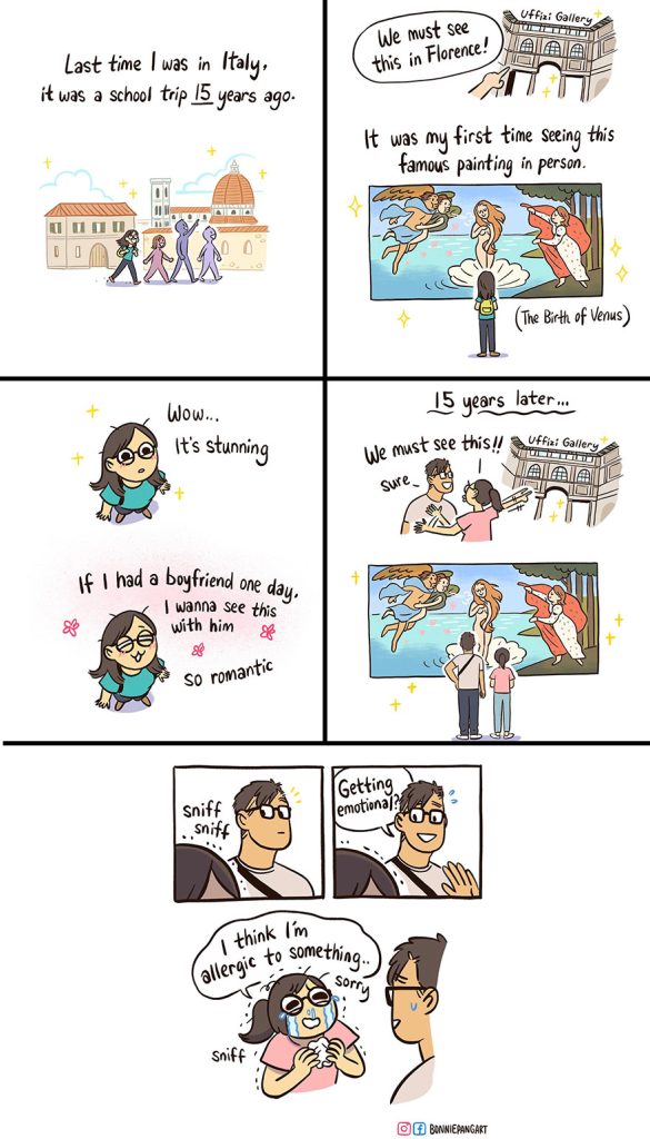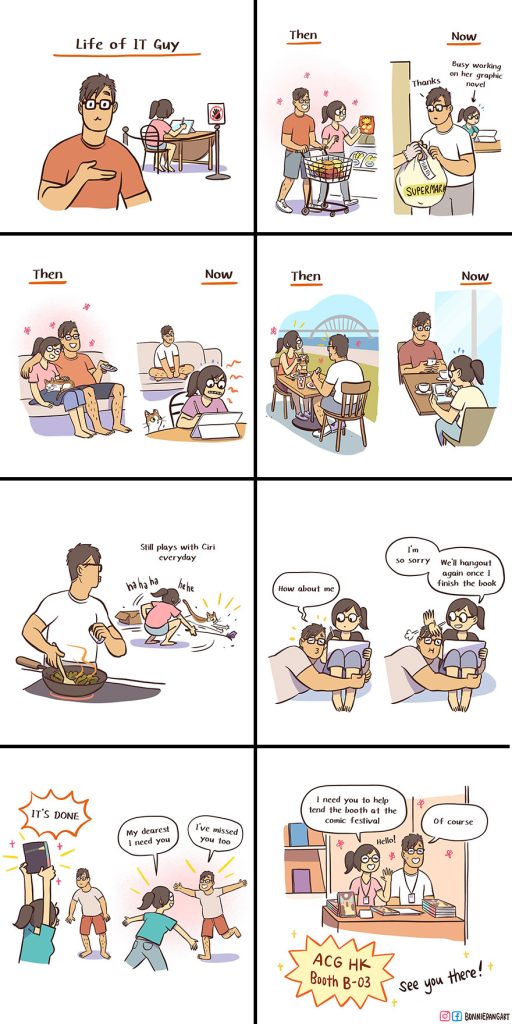 Bonnie Pang carefully selects moments for IT Guy & Art Girl that resonate emotionally or spark laughter. She shared, that I pick moments that made us laugh or feel deeply. I also focus on things I think will make readers laugh or feel touched. Sometimes it’s the interesting contrast between an artist and an IT person and other times it’s memorable life events like getting married receiving awards or traveling. We adopted a cat not too long ago and pets have become a regular theme in my comics since then. By highlighting these relatable heartfelt moments Bonnie can create comics that connect with her audience while sharing the personal and humorous aspects of her life.