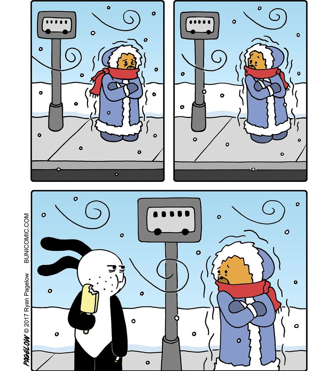 Ryan Pagelow, the genius behind the beloved Buni Comic series has perfected the art of storytelling with no words at all. Known for his quirky and dark sense of humor, Ryan masterfully blends simple concepts such as food, exhaustion, or animals with unexpected twists that transcend cultural and linguistic boundaries. By day Ryan works as a photographer but in his spare time, he channels his creativity into turning everyday moments into surreal and thought-provoking comics that leave his readers laughing pondering, or sometimes both.