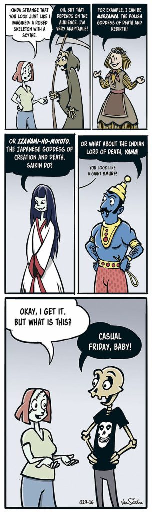 We were curious if Van Santen had ever received messages from people who found comfort in his comics while dealing with loss. Here’s what he shared, I’ve received lots of messages from many people but not necessarily from those dealing with loss. I did, however, hear from someone who found my version of the afterlife so much more interesting than her own life that she wanted to die. That was upsetting and sad. But mostly, I get messages from people who enjoy the comic and encourage me to keep up the good work as long as they don’t have to pay. Or they want to collaborate on promoting pet food, jewelry, or other super relevant stuff. Oh, and one guy wanted to know the Maiden’s bra size.