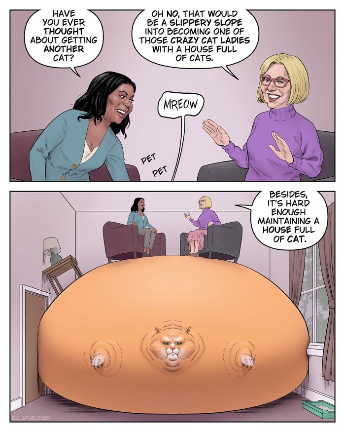 When asked about his process for generating new ideas for his comics D.C. Stuelpner revealed his unique routine. Every night while I’m in the shower, I force myself to come up with a comic strip idea. I usually reflect on things I’ve seen during the day or pick a random topic or common saying and try to find the humor in it. If I’ve turned into a prune from the water before landing on an idea I’ll step out sit in a dark room and give myself another 10-15 minutes to brainstorm. Most of the time what I come up with is pretty bad but occasionally I hit on something worth drawing. Then I’ll sketch it out read it back and wish I had spent a little more time in that dark room.