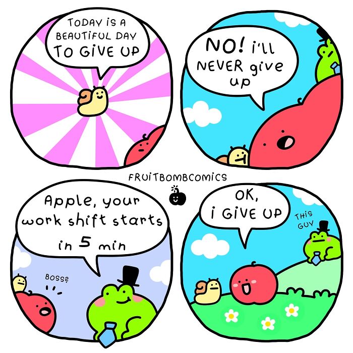 We reached out to Simon again to dive deeper into his humorous comic series, where fruit characters tackle everyday challenges like procrastination and awkward social situations. When asked if there’s a particular scenario that resonates with him Simon shared that I think many of the work-related situations in my comics will be familiar to most of us. I always depict everything absurdly but there’s definitely a bit of truth in every comic. My favorite situation is when Apple’s boss tries to reach him by phone or email but Apple doesn’t want to respond. It’s something I often experience at work.
