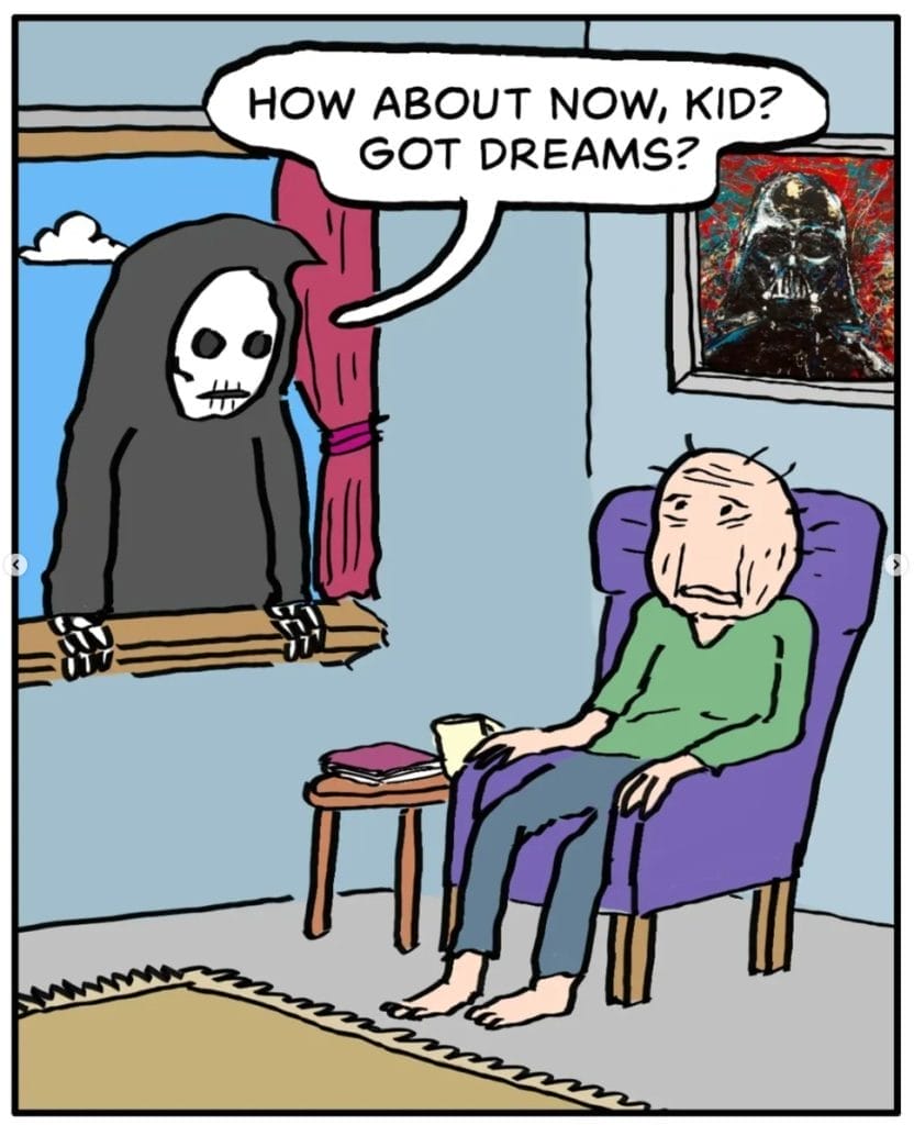 Dave Contra uses repetition as a storytelling device: the same question (“Got dreams?”) asked at different life stages forces us to reflect on our own shifting ambitions. The Grim Reaper’s consistent presence is a reminder that time is always ticking, whether we’re flying high on dreams or just “hanging in there.”