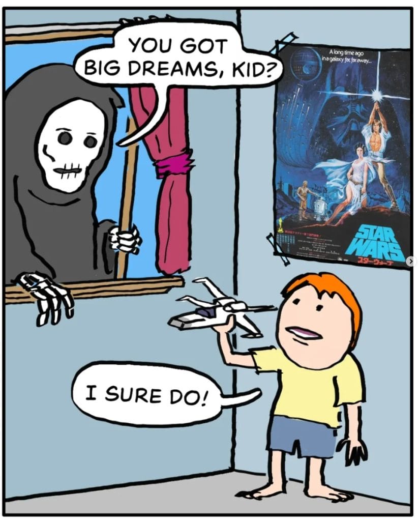 We open in a child’s bedroom. A young boy stands holding a toy X-Wing fighter, a Star Wars poster on the wall behind him. Death—hooded and skeletal—leans through the open window and asks, “You got big dreams, kid?” The boy grins and answers, “I sure do!” In this moment, the innocence of youth shines through—dreams are limitless, and life feels like it’s just beginning.