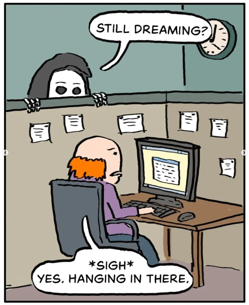 We move forward again. The man, now older and balding, sits in a bland office cubicle, typing at a computer. Death peeks over the divider and asks, “Still dreaming?” This time, the man’s reply is quieter: “Sigh Yes. Hanging in there.” The setting says it all—dreams aren’t gone, but they’ve been boxed in by the routine and responsibilities of middle age.