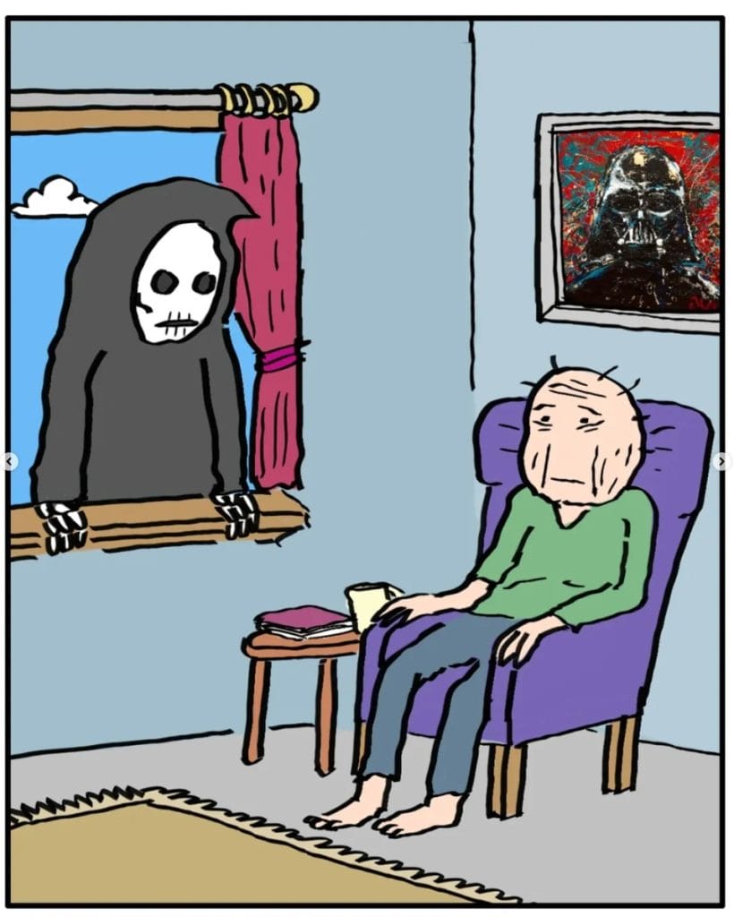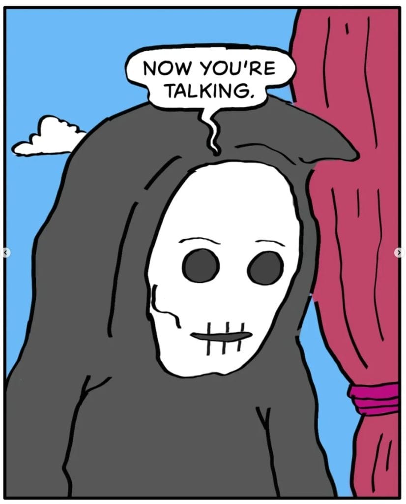 Death smirks slightly and says, “Now you’re talking.” It’s darkly humorous—only when the man fully accepts the fleeting nature of life does Death seem satisfied.