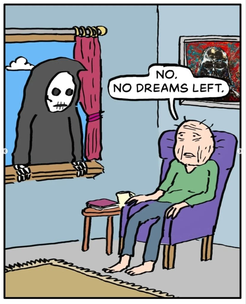 Some comics make you laugh, others make you think—and then there are those rare ones that do both while tugging on your heartstrings. Dave Contra’s Got Dreams? is one such story. Told across a series of simple yet emotionally charged panels, it captures the evolution of a person’s dreams from childhood to old age, with a constant silent observer—the Grim Reaper—reminding us of life’s finite nature.