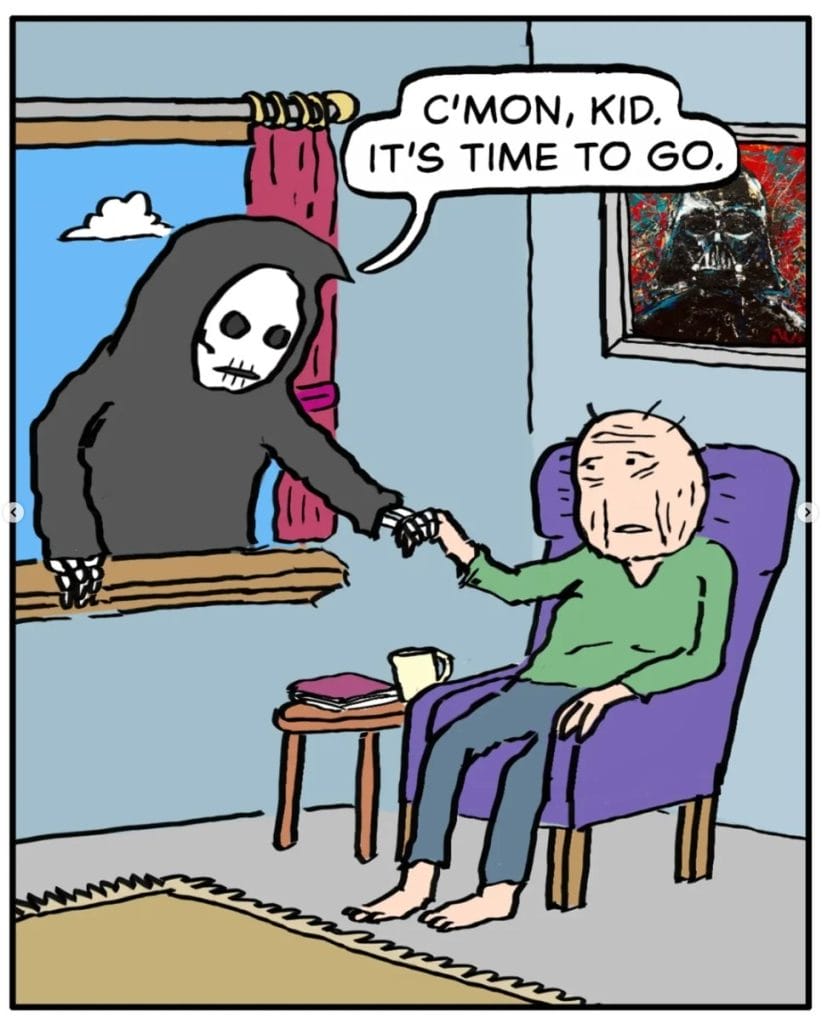 In the final moment, Death reaches out his hand. “C’mon, kid. It’s time to go.” The man accepts. But in the next image, we see something powerful—the man walking away hand-in-hand with Death, transformed back into his younger self, holding the toy X-Wing high in the air, returning to the child who once dreamed without limits.