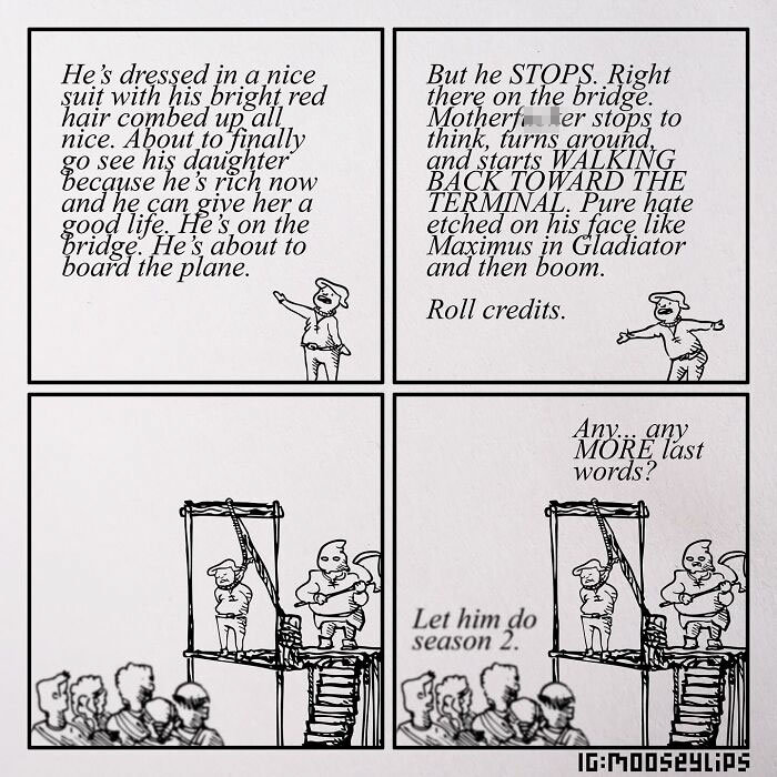 Some of you may be hearing the name Mooseylips for the first time, while others true comic enthusiasts are probably already familiar with this one-of-a-kind artist. His work is a whirlwind of absurdity filled with bizarre characters and humor that defies all logic and that’s exactly what makes Mooseylips comics so brilliant. The artist describes his creative process as a mix of Shel Silverstein and Dr. Seuss with a few hours of social media and a dash of pure chaos. Mooseylips comics feel like they’ve come from a parallel universe, where nonsense reigns and laughter is unstoppable. If you love limitless humor and a truly unique art style check out more of Mooseylips’ comics in our previous article. After all a bit of madness in your daily feed is always a good idea.