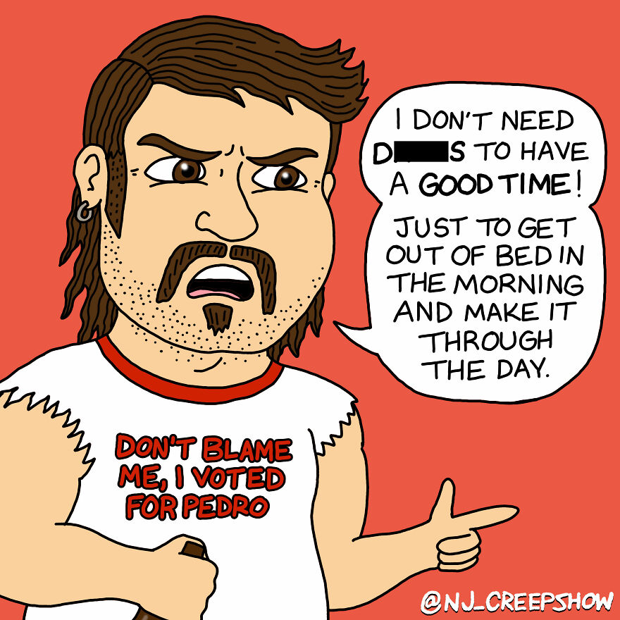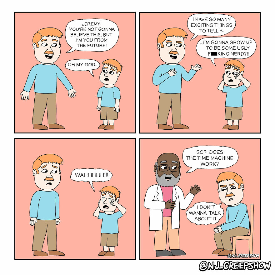 Since the tone of my work is usually pretty silly, I love filling my comics with idiots and jerks who lack self-awareness. A lot of the funniest moments in life come from failure and embarrassment, so I prefer creating characters who are the ones getting laughed at, not the ones doing the laughing. I’m not interested in the typical high school quarterback who beats the odds to win the big game and get the girl. Instead, I want to focus on the dork in the marching band who ends up wetting his pants on the field in front of the whole school.