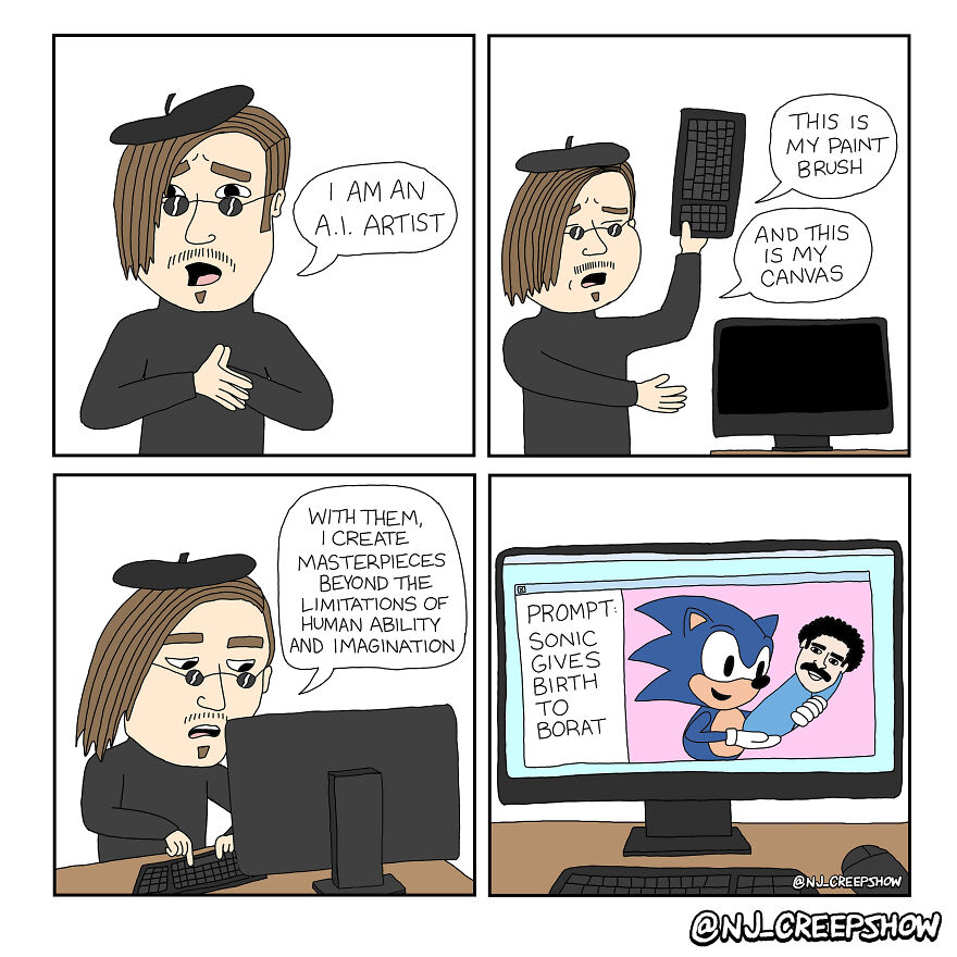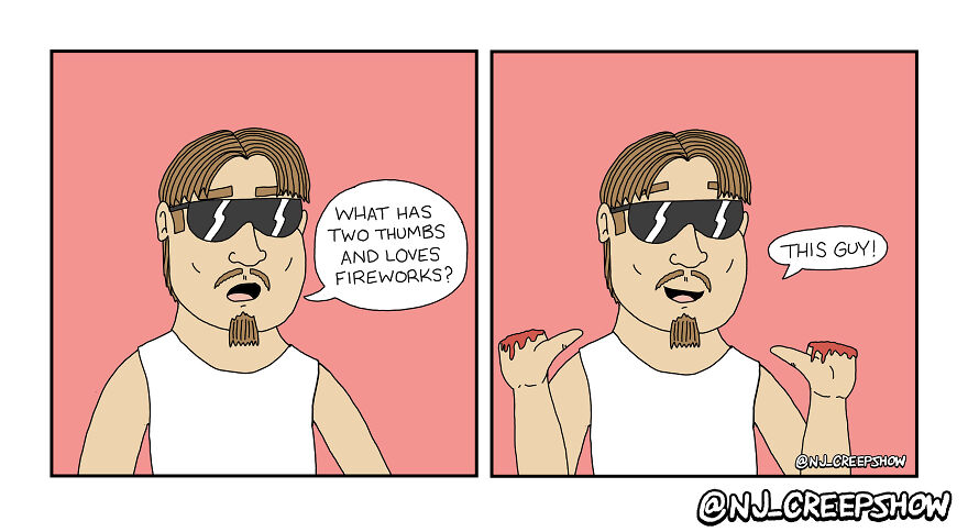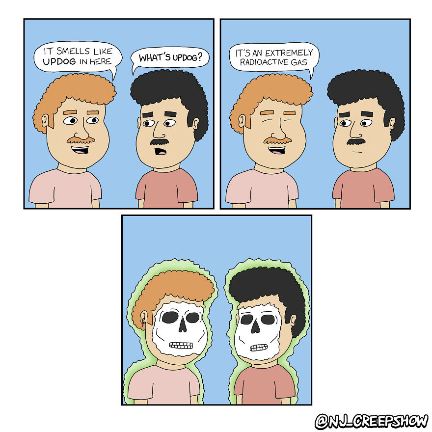 Coming up with comic ideas is like freeform jazz in my brain lots of improvisation, and most of it is pretty terrible. I usually start with a simple everyday topic or situation and play around with it until something makes me laugh. Or sometimes, I’ll doodle a goofy-looking character and wonder what they might say. Other times, I think about what I’d like to see when I’m browsing for comics and art. If I can’t find anything that scratches that 90s horror nostalgia itch I’ll just create it myself. It’s an amazing feeling to be able to say, I made that instead of I wish I made that.