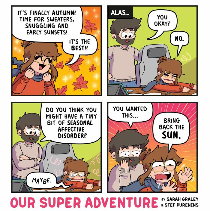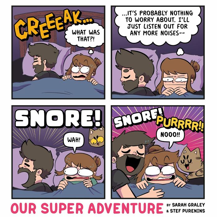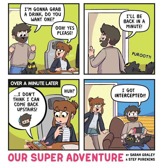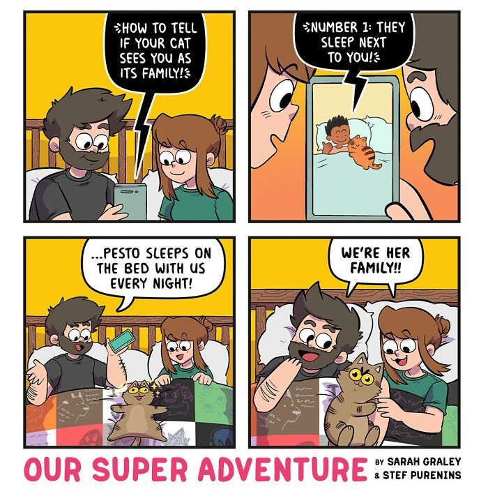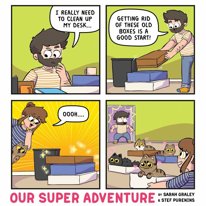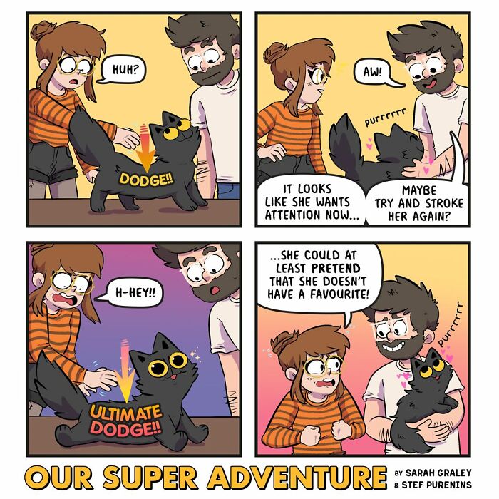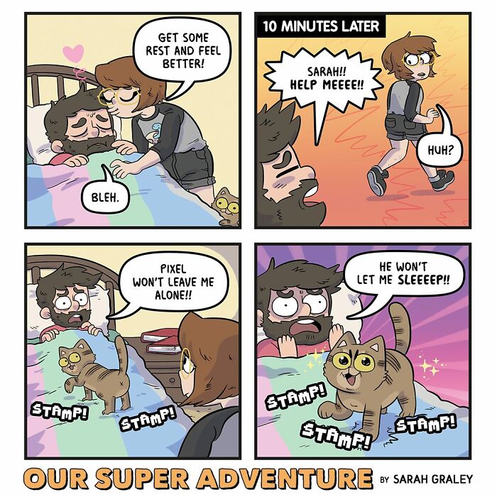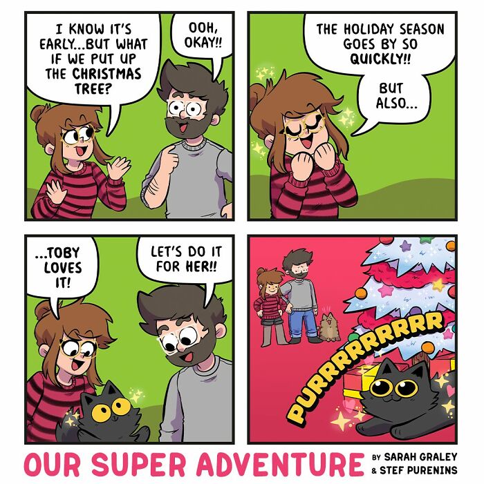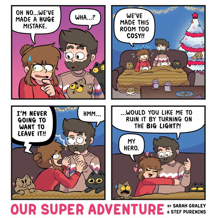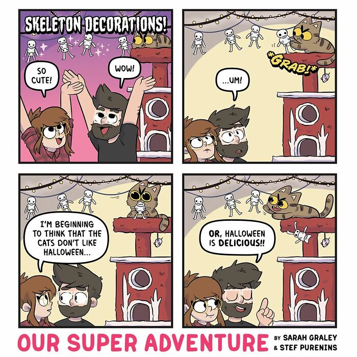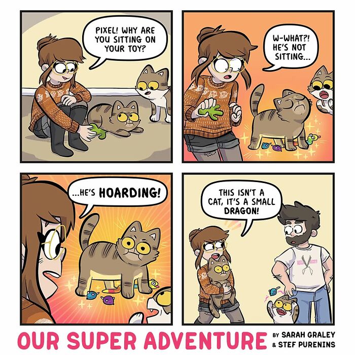 Through her popular Our Super Adventure comic series Sarah perfectly captures the humorous heartwarming chaos of daily life. Whether it’s navigating the ups and downs of relationships or dealing with the never-ending antics of her feline companions Sarah’s illustrations shine a light on life’s simple joys and occasional mishaps. Her unique blend of humor love and all things cat-related offers a delightful escape and a perfect mix of warmth and comedy that’s sure to bring a smile to your face.
