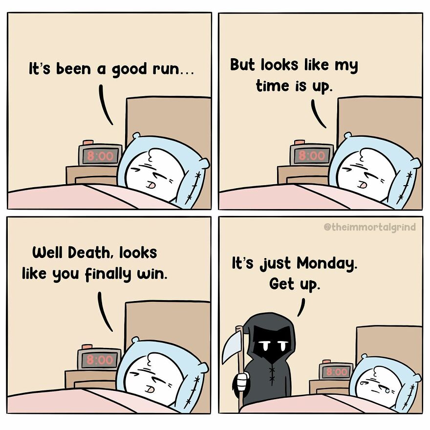When it comes to explaining the theme of the afterlife in his comics Burly has a unique perspective. In my comic, I imagine the afterlife as not so glamorous, kind of mirroring the daily grind people go through here on Earth. Is it really like that? Let’s hope not he said with a chuckle. This slightly dark yet humorous take on the afterlife is reflected in his bio, which simply reads Chronicling the daily life of the afterlife. It’s this clever mix of the mundane and the surreal that gives his comics their charm turning what could be a heavy topic into something light-hearted and fun.