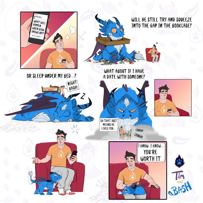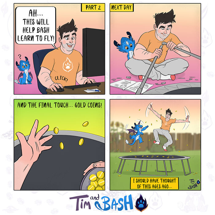 Despite the trouble that his fiery little friend causes, Tim remains dedicated to training him using gold coins as treats though with Bash’s newfound wealth it’s hard to say who’s really in charge. From hilarious moments of unintentional chaos to heartwarming scenes of friendship Tim and Bash’s day-to-day life is nothing short of entertaining. Check out these videos and comics chronicling the unpredictable and adorable adventures of Tim and his fiery buddy Bash.